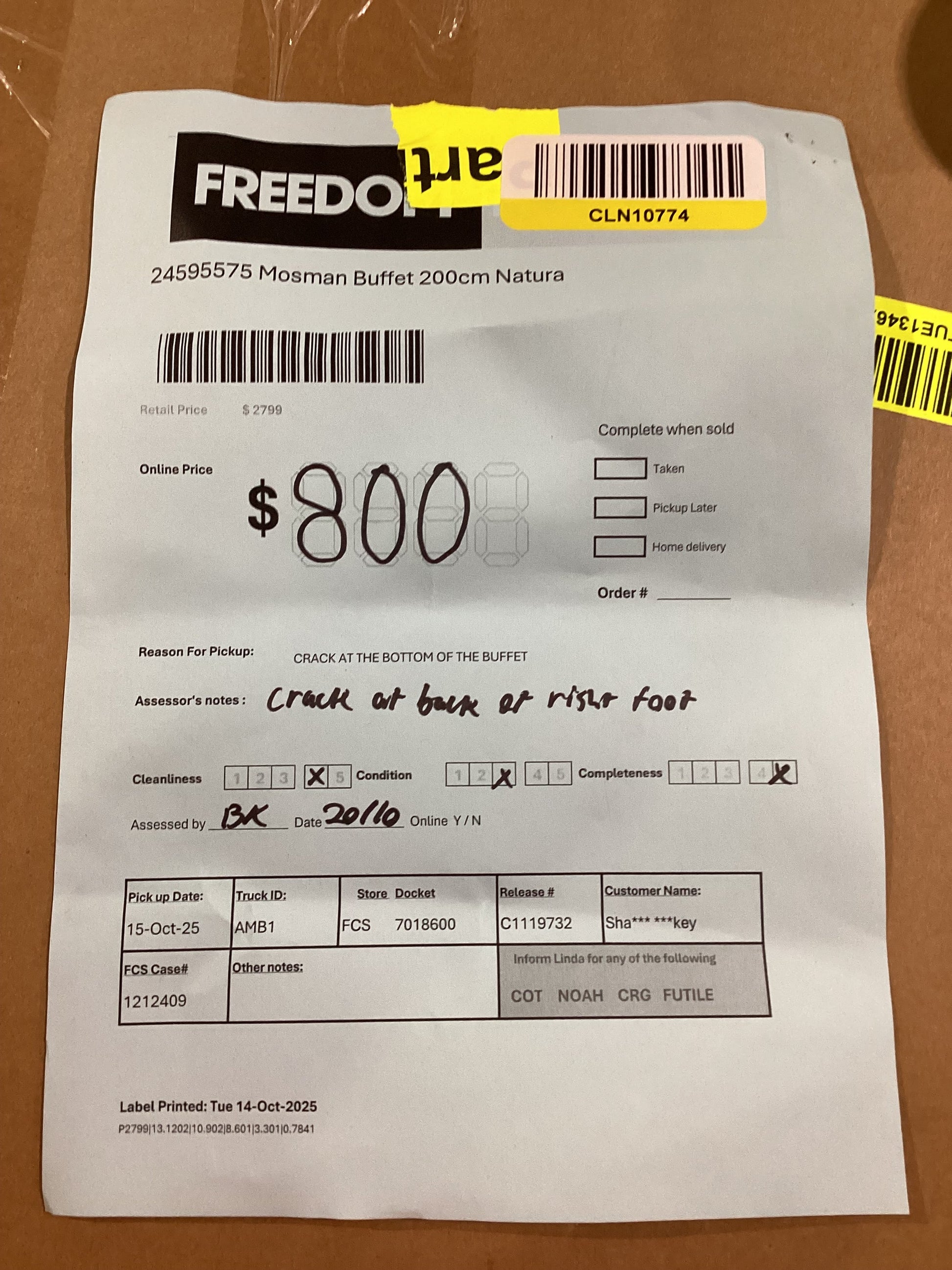 ASSESSOR NOTES: Crack at back of right foot