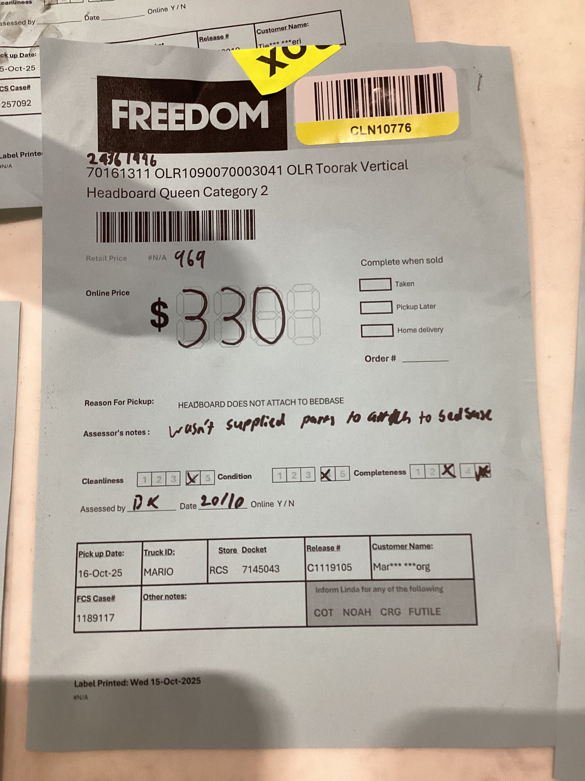 ASSESSOR NOTES: Wasnt supplied parts to attatch to bed base
